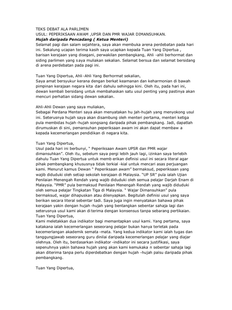 Contoh Teks Debat Ala Parlimen pemansuhan Peperiksaan USUL. Teks perdana menteri 1. Nasib generasi m uda Mala ysia.
